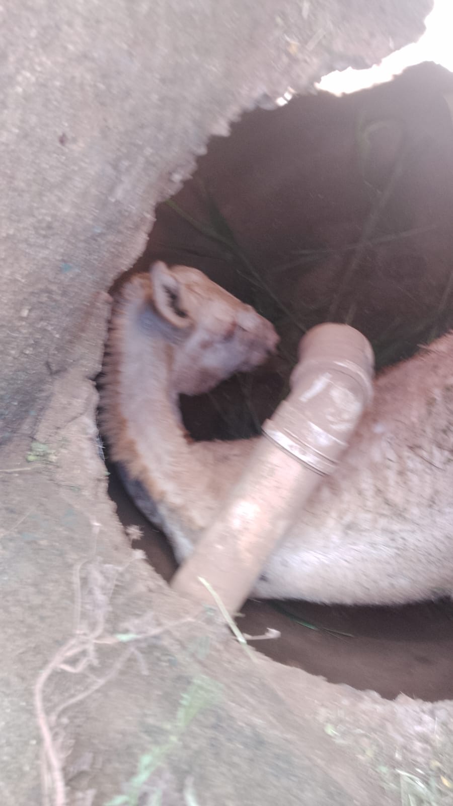 Ao chegarem à ocorrência, os militares realizaram a análise da situação e constataram que a abertura estreita do bueiro representava risco de ferimentos ao animal durante a retirada. Diante disso, foi solicitado apoio de uma retroescavadeira junto à Prefeitura Municipal e ao SAAE. No entanto, por motivos diversos, não foi possível a disponibilização do equipamento.